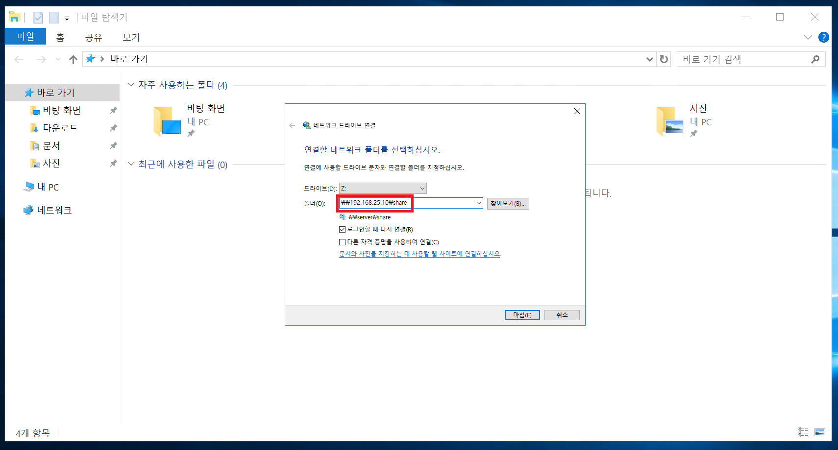 - 파일 탐색기 -> 네트워크 우클릭 -> 네트워크 드라이브 연결