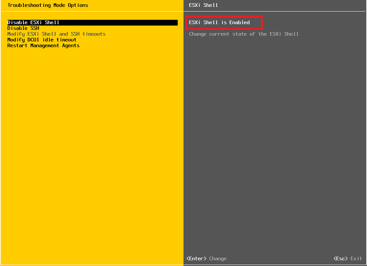 - Troubleshooting Mode Options -> Disable ESXi Shell