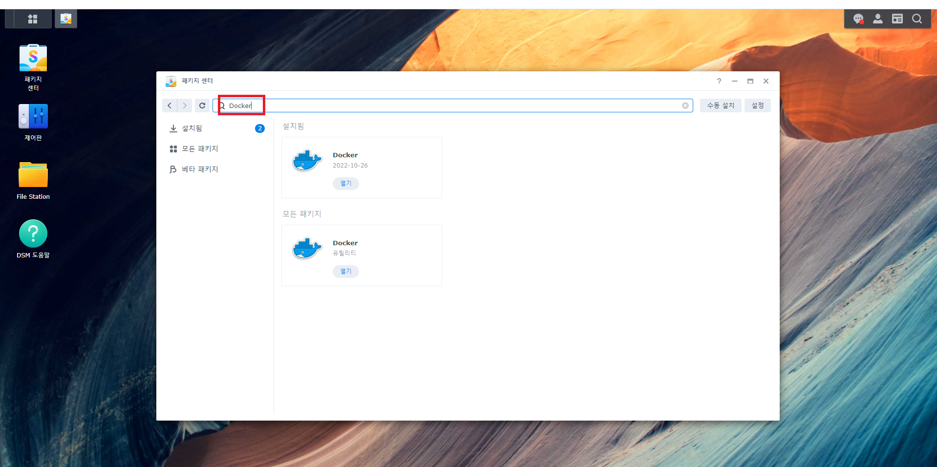 1. DSM 접속 후 -> 패키지 센터 -> Docker 패키지 검색