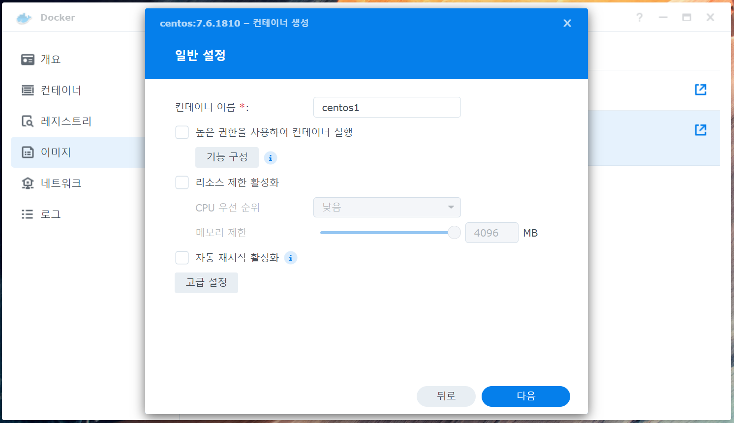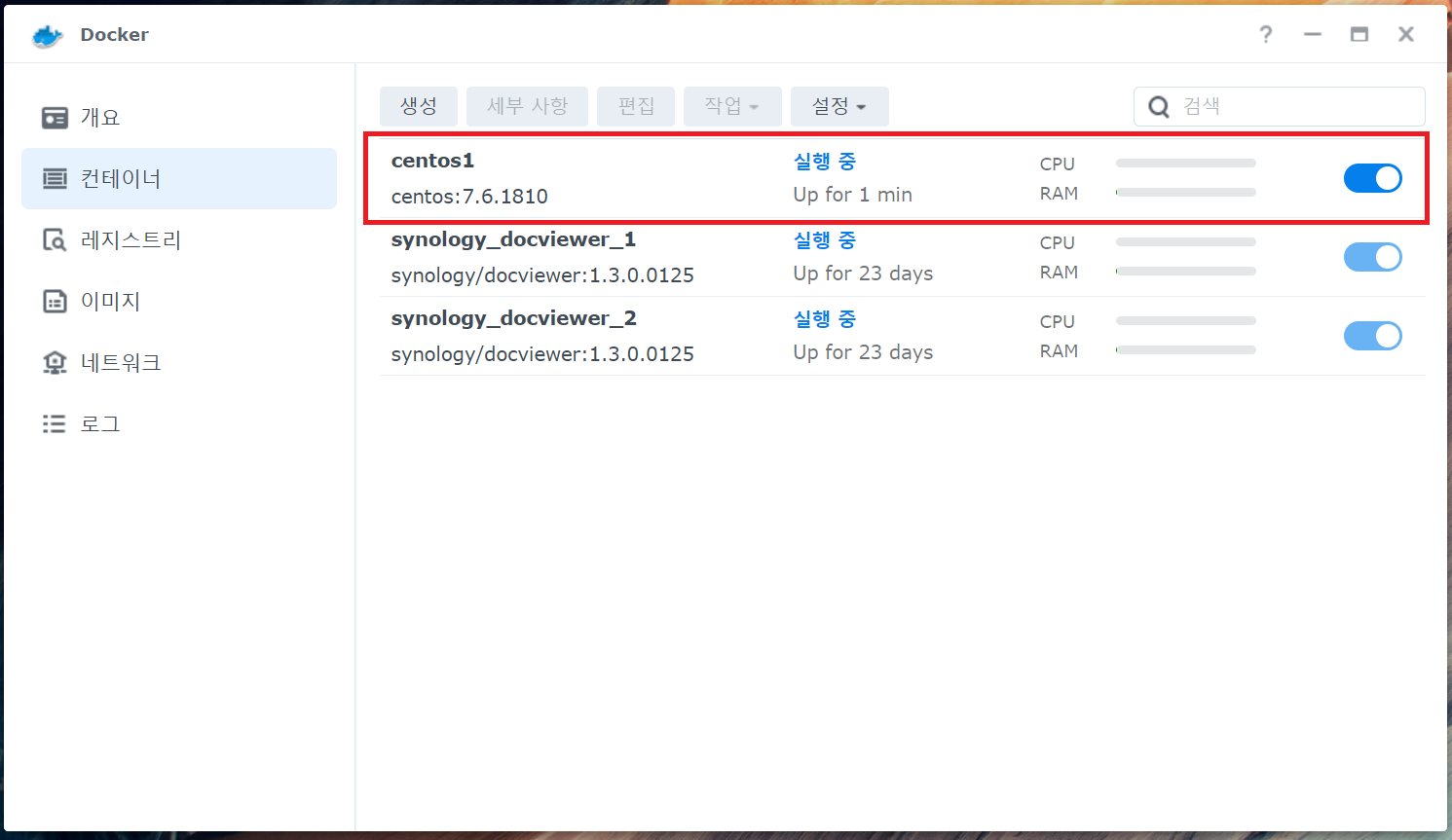 3. Docker 접속 후 레지스트리 클릭 -> centos 다운로드