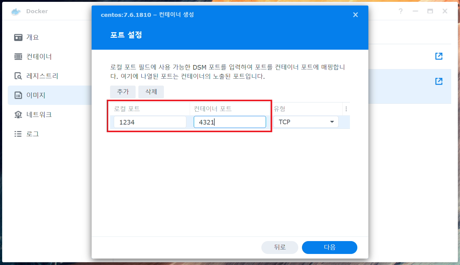 ※현재 DSM IP 주소의 로컬 포트와 컨테이너 생성 후 만들 포트를 포트 포워딩 해주는 개념이다.