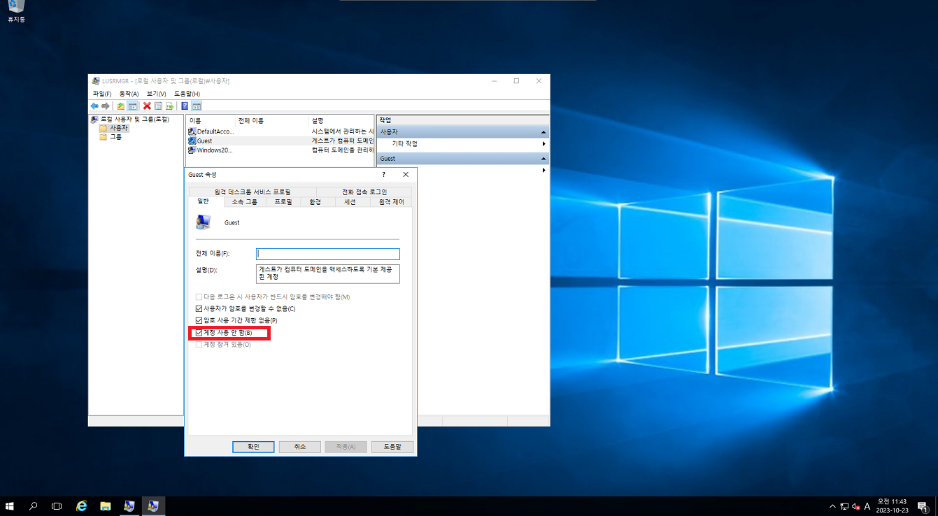 2. 사용자 - GUEST - 속성 - 계정 사용 안 함 체크