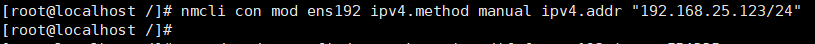 #nmcli con mod ens192 ipv4.method manual ipv4.addr "192.168.25.123/24"