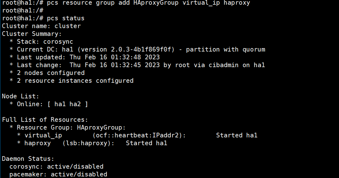 #pcs resource create haproxy lsb:haproxy conffile=/etc/haproxy/haproxy.cfg op monitor interval=10s --force