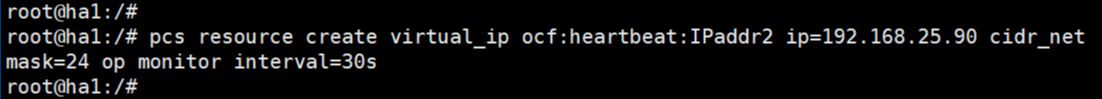#pcs resource create virtual_ip ocf:heartbeat:IPaddr2 ip=192.168.25.90 cidr_netmask=24 opmonitor interval=30s
