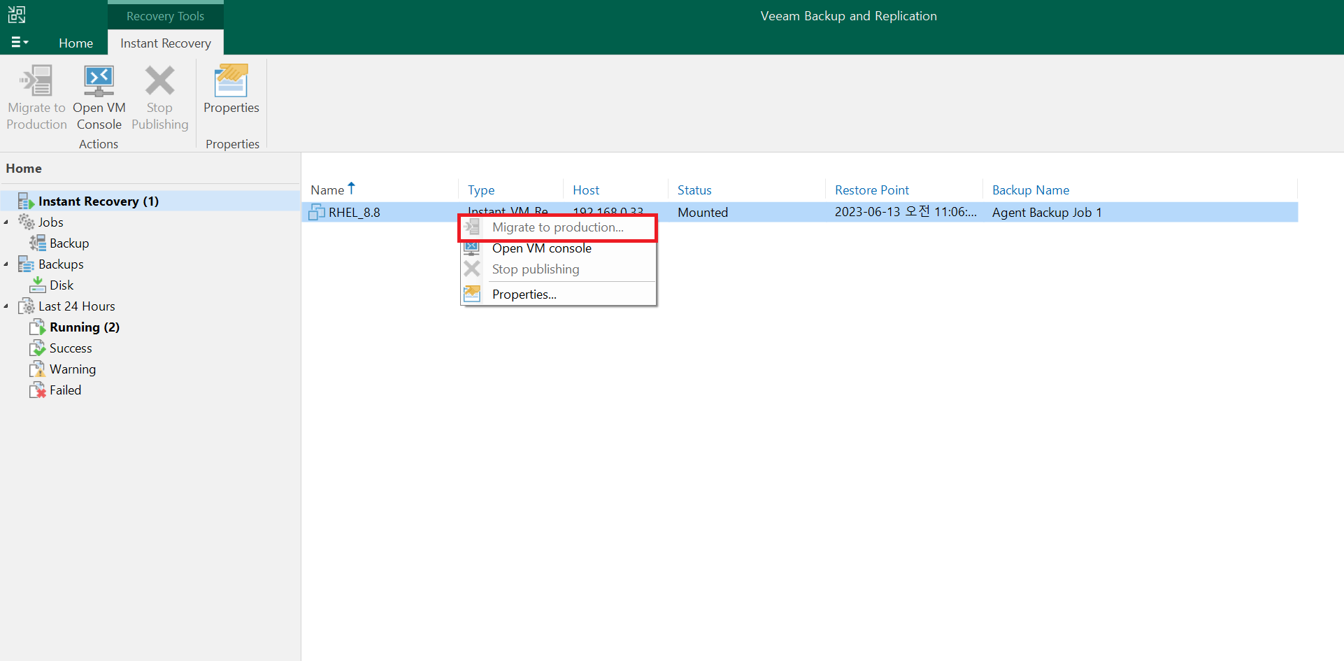 - Instant Recovery 메뉴 클릭 후 -> 원하는 Host 우클릭 후 -> Migrate to production... 클릭